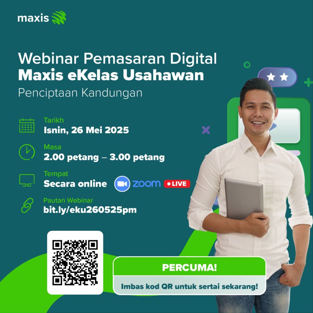 Webinar Maxis eKelas Usahawan yang akan diadakan secara dalam talian. Webinar ini terbahagi kepada dua sesi mengikut modul seperti berikut:
