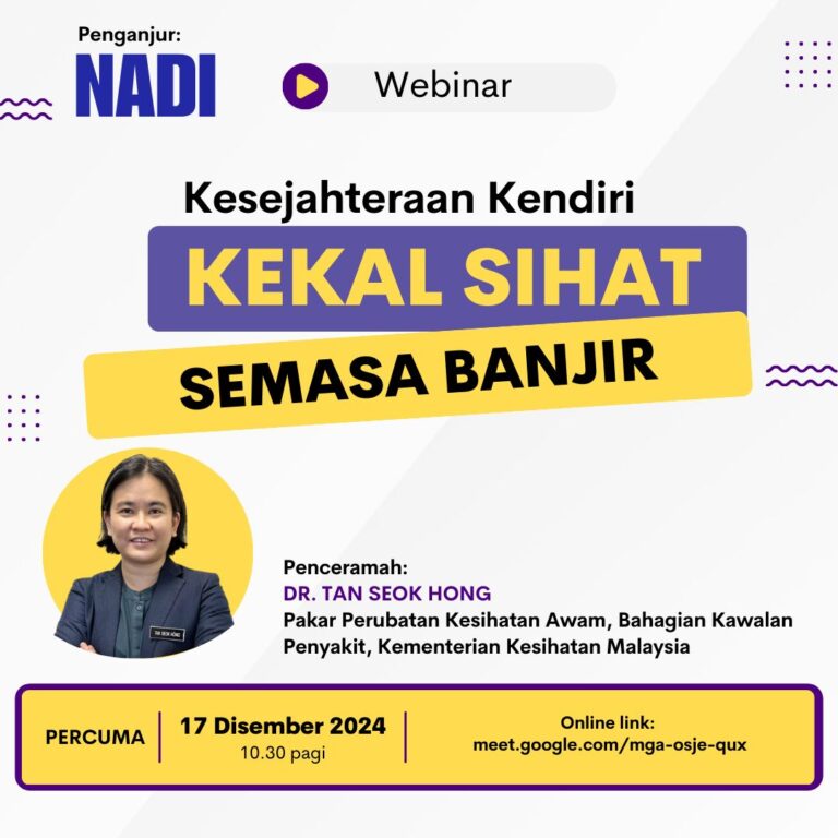 Adakah anda bersedia menghadapi musim banjir? tahukah anda bencana banjir membawa risiko penyakit yang boleh mengancam kesihatan diri dan keluarga. Sertai webinar NADI Kesejahteraan Kendiri pada 17hb Disember 2024 pukul 10.30 pagi bersama- sama Dr Tan Seok Hong, Pakar Perubatan […]