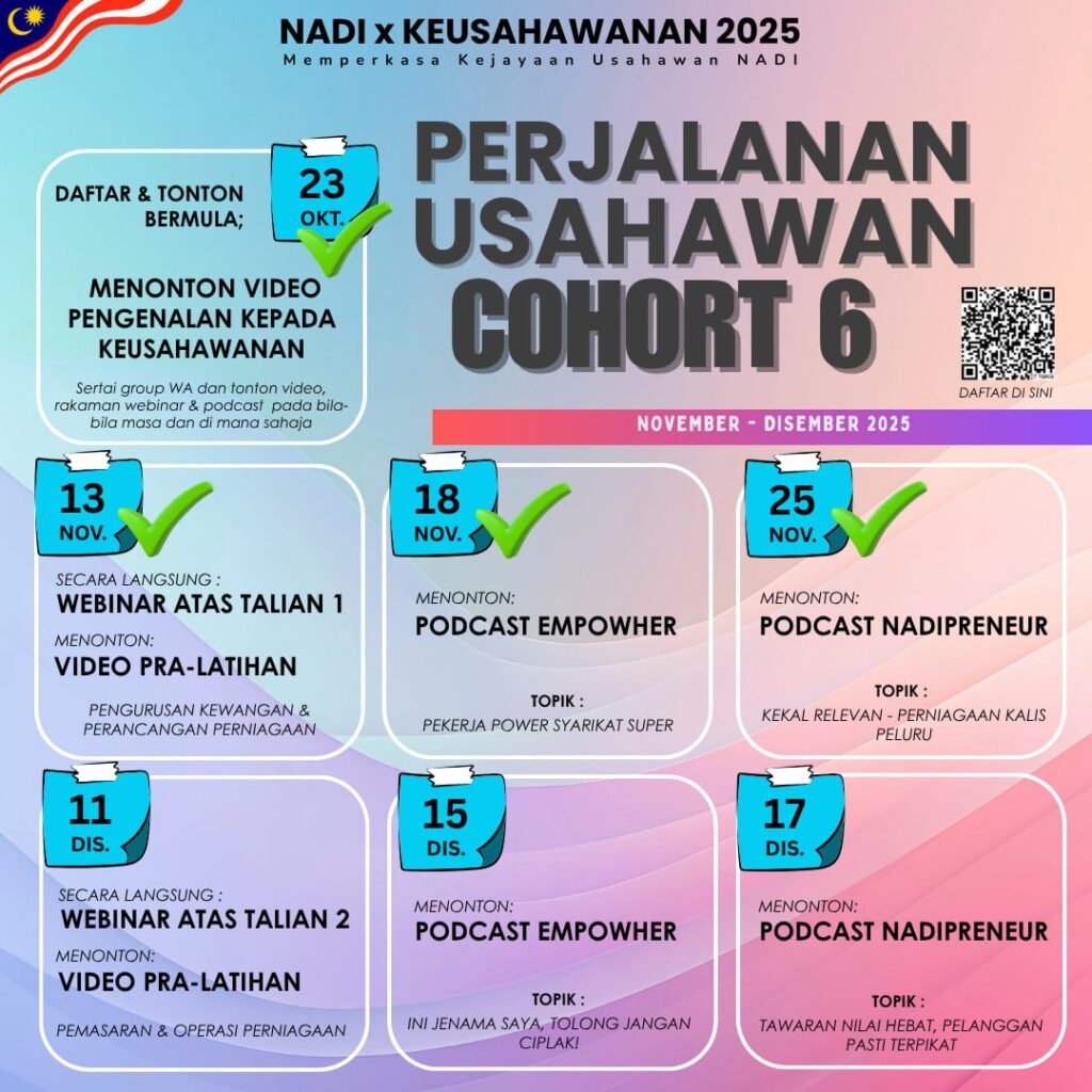 Berikut merupakan timeline perjalanan Usahawan Cohort 6 yang akan berakhir pada 17 Disember 2025 nanti: